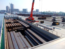 取扱貨物として、H鋼 コイル 鉄板等の鋼材、並びに梁材 PC材 鉄骨、プラント、化成品 巻取紙 バラ貨物など多岐にわたります。